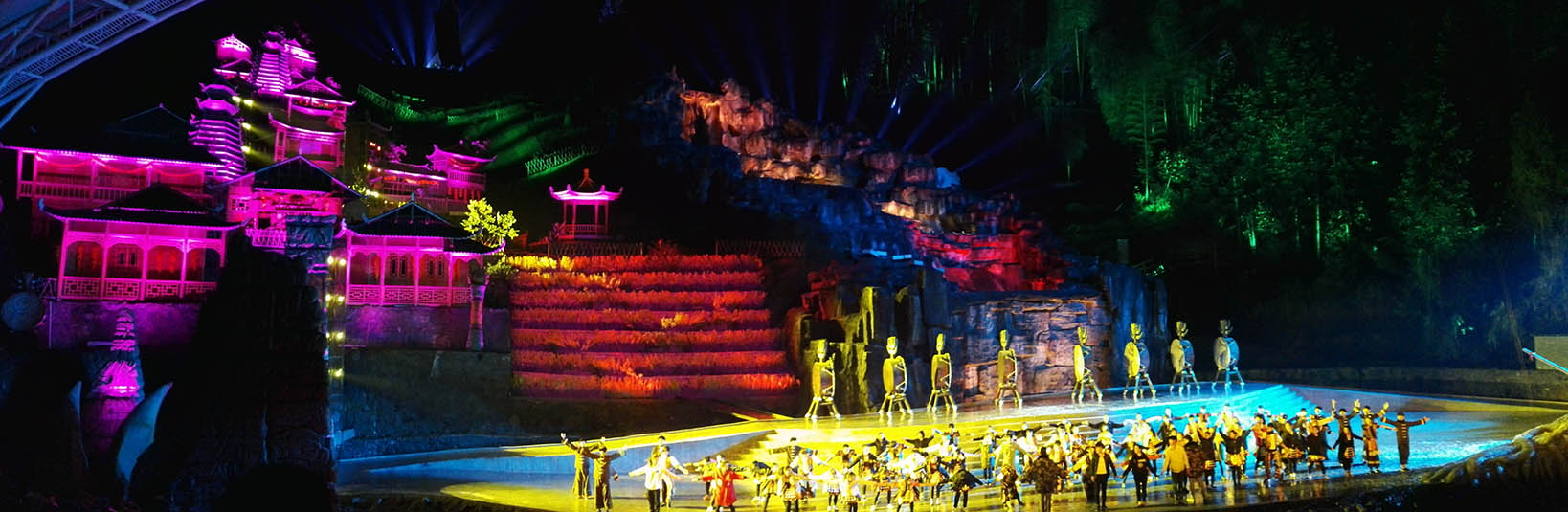 浩洋電子通過極富創意的燈光設計和表現力十足的燈光應用,準確地描繪出侗寨的文化特性,將燈光演繹與當地的山水風景完美融合,共同構成一個演出的整體,為《薩瑪》增添了新的藝術形態,衍生出了新的看點,成為貴州省內極具民族文化特色的旅游演藝新標桿!