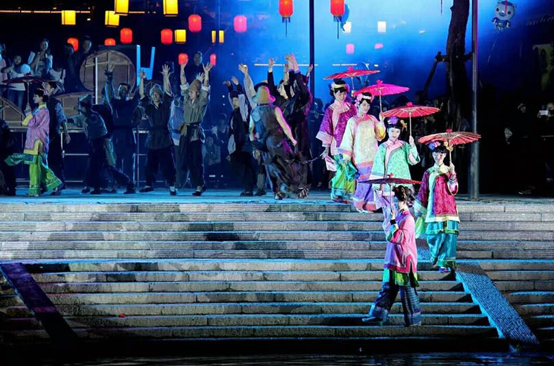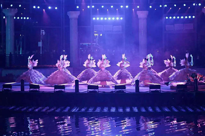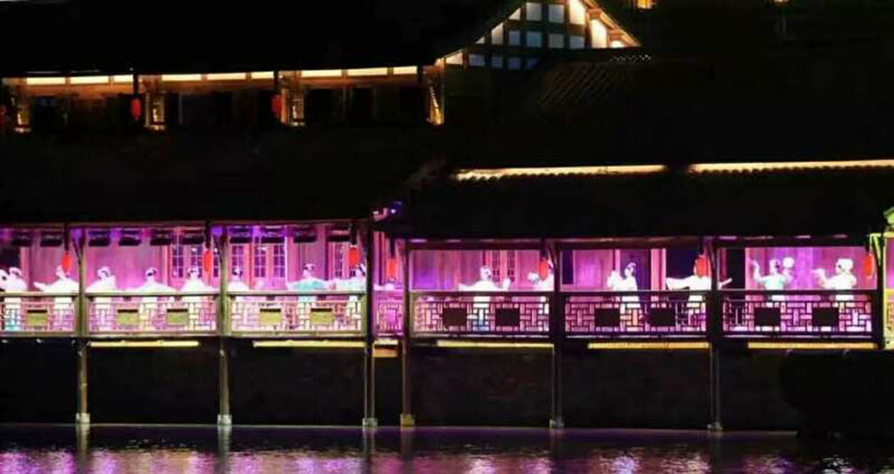 《夢回穿紫河》圍繞“河”“船”“人”三個關鍵詞,分“紫漁歌”、“依水筑城”、“河街舊事“、“浪漫之旅”四個篇章,利用大船、燈光、煙花等元素,將常德文化與現代機械光電技術結合,還原包括“古河”、“桃花源”、“沅水號子”等文化藝術印象,將觀眾帶入一個光與影交相輝映、水與人和諧共存的美好境界。乘坐“水上巴士”沿著11公里長的穿紫河河道游覽,享受常德老河街原景、折子戲、常德絲弦、劉海砍樵音樂劇等實景演出,再配合燈光特效等高科技手法,常德本地民俗文化與現代科技的完美結合,打造出一場古典與現代結合的唯美大賞。