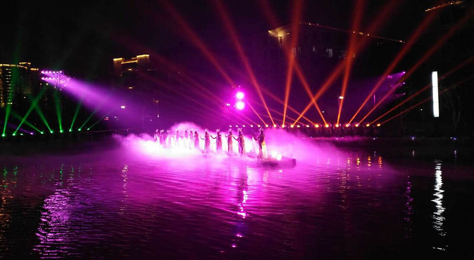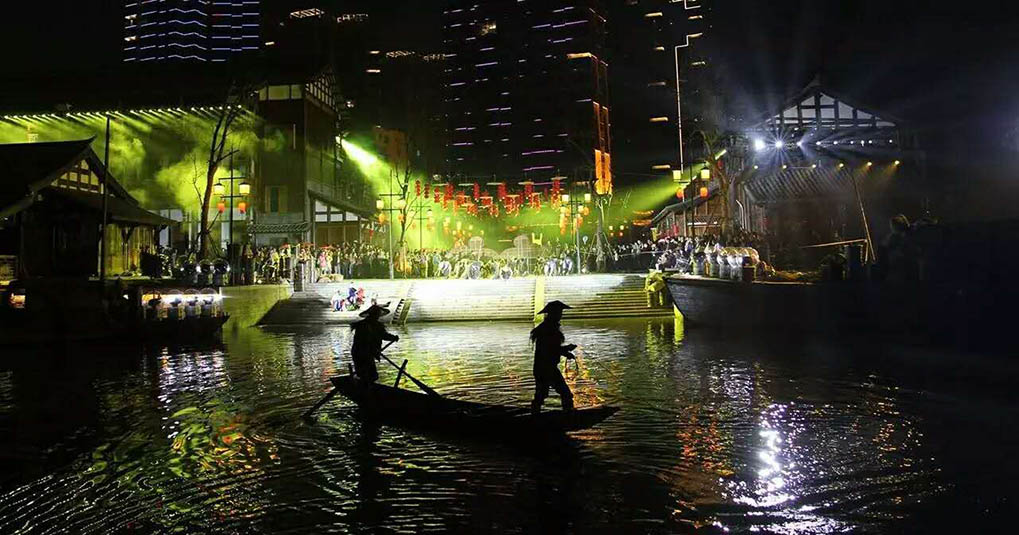 《夢回穿紫河》是由湖南省演藝集團與經山水公司共同整合相關資源,并集合國內最優秀的編創團隊,歷時半年,精心打造的湖南首臺城市風情實景燈光演出秀。浩洋電子傾力參與打造,承擔了從系統設計、設備供應、安裝實施、彩排合成到技術服務支持的全部燈光工程內容,應用浩洋電子旗下特寶麗品牌14R及20R三合一電腦燈、圖案切割燈PT801P、LED PAR燈A59、防水罩WP06等近500臺專業燈光產品,通過燈光設計與演出內容的緊密結合,巧妙地將的唯美絢麗的燈光與旖旎的穿紫河水融為一體,為游客呈現了一場具有濃郁水鄉風情及豐厚人文底蘊的光影藝術饗宴。《夢回穿紫河》的精彩首秀,接連獲得社會各界的高度好評!