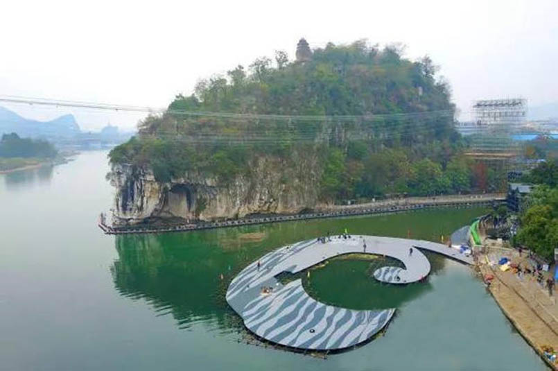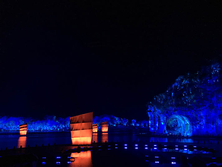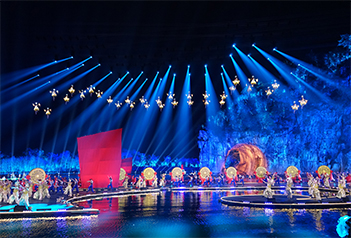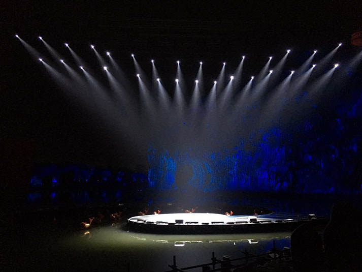 桂林象鼻山是今年央視春晚分會(huì)場(chǎng)之一,在舞臺(tái)搭建方面,以象鼻山作為整個(gè)舞臺(tái)的天然背景,突出象鼻山這一桂林山水文化元素,打造有“象山水月”寓意的舞臺(tái)效果。以山與水結(jié)合作為演出舞臺(tái),舞臺(tái)燈具沒(méi)有辦法在水面上或者半空中搭建桁架,為此次戶外實(shí)景演出增加極大的難度。