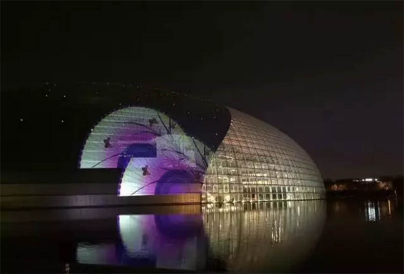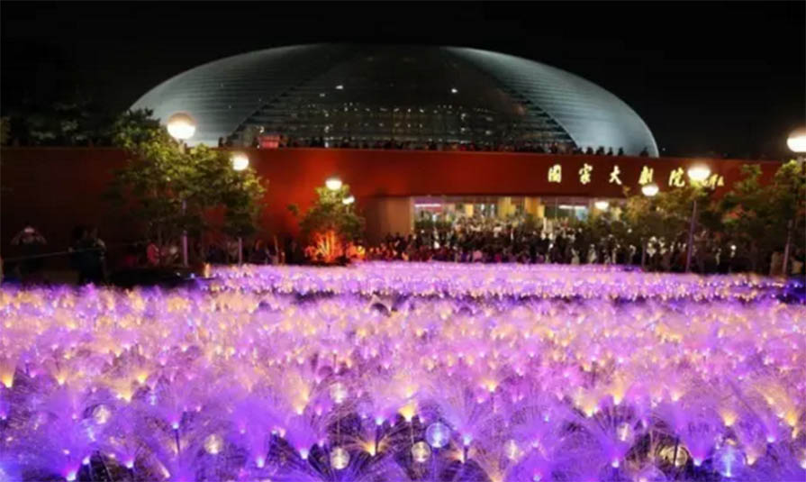 晚會當晚,國家大劇院殼體、水面,及周邊建筑被集體打亮,其場面宏大、氣勢非凡。國家大劇院在三種顏色的基礎上,增加至8種燈光顏色循環變換,北門處增加了“花海”燈光裝飾效果,呈現燈光璀璨的壯觀場面。