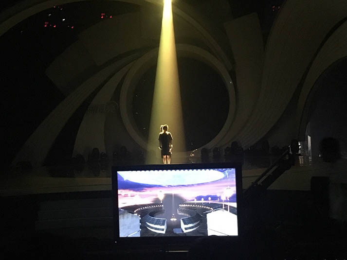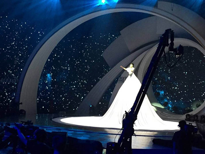浩洋電子切割燈V3000P設置于舞臺面光和頂光位,染色燈V2000W則主要擔負大范圍鋪光染色效果,上圖是切割燈V3000P在晚會上的精彩表現(xiàn),女神趙雅芝在聲光電制造的舞美效果中,優(yōu)雅獻唱,效果非凡。