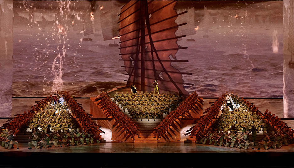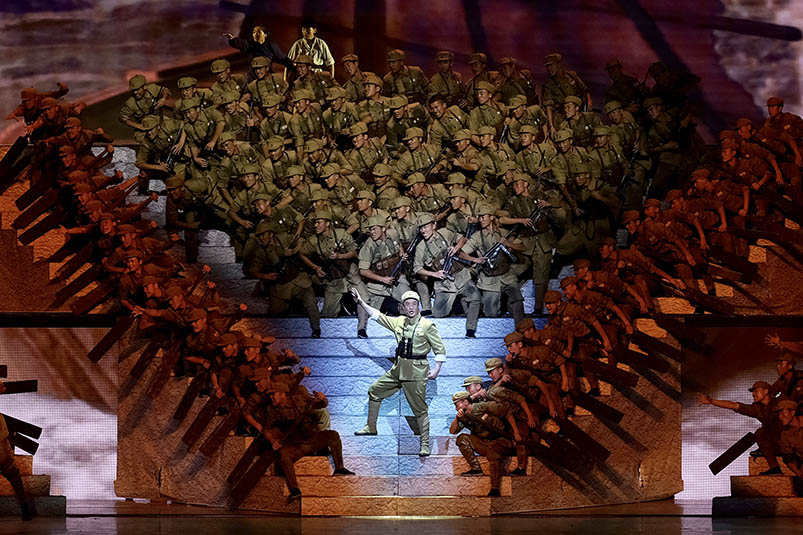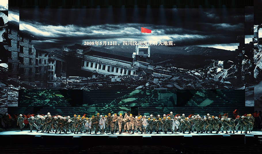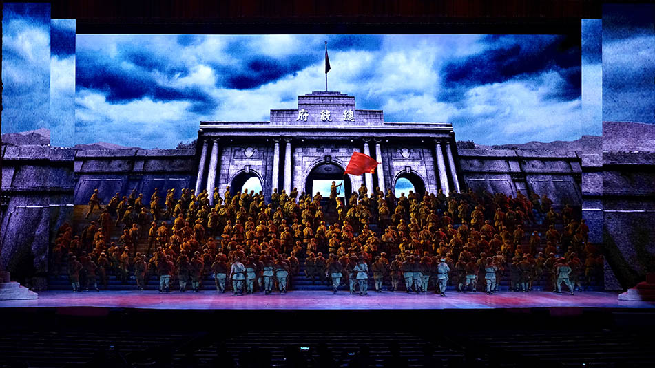 舞臺上舞美布景與燈光、視頻、投影等舞臺視覺形式的有機融合是晚會的亮點與難點。如此豪邁氣概的演出得益于晚會陣容強大的幕后團隊:總導演楊笑陽、舞美總設計孫天衛、燈光總設計沙曉嵐、音頻總設計何飚再加上其他行業精英成員強強聯合,以舞美、燈光、音響、投影、視頻、舞臺機械等多種舞臺手段,呈現出恢弘壯麗的舞臺效果。
