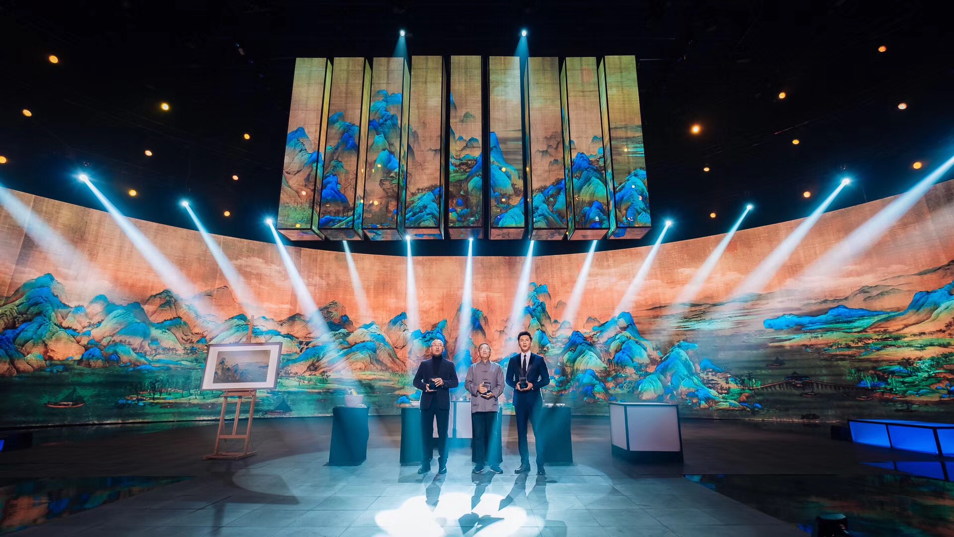 在舞美方面,《國家寶藏》節目組特別將所有舞臺主視覺都設置在一塊長43米、高7米的巨型LED環幕上,讓觀眾在見不到國寶實物的情況下也能以直觀的感受體驗到國寶的震撼美。在整個舞臺的設計上,節目組將中國古典韻味和現代舞臺科技相結合,融合紗盒投影視覺呈現、透視冰屏柱視覺呈現、透視冰屏柱臺型變幻、巨型環幕視覺呈現四大特點于一體。在場景環境的構建與更替上都呈現出精致逼真的舞臺效果,這種舞臺視覺上的極致沖擊力也成為節目吸引眼球的一大亮點。