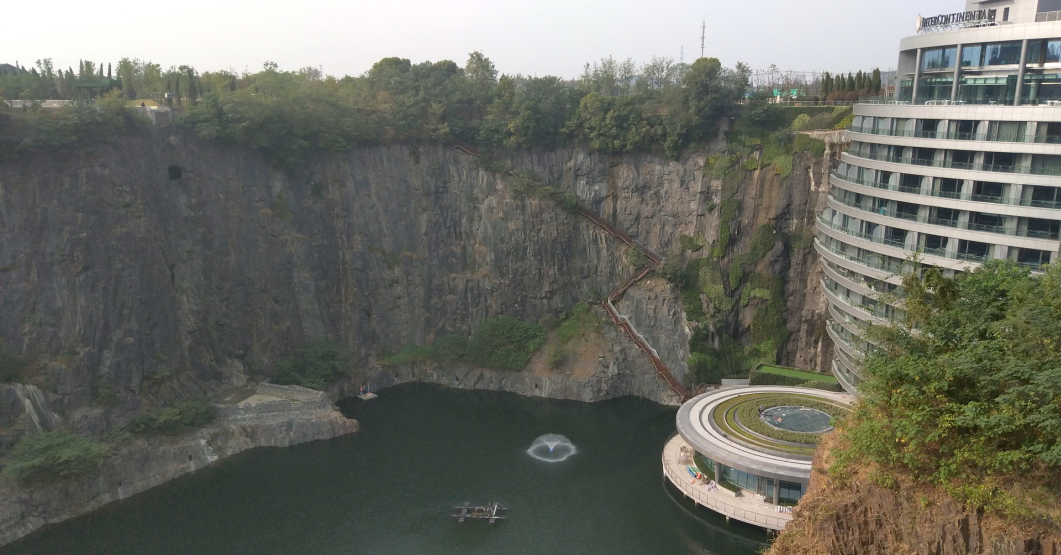 上海佘山世貿(mào)洲際酒店(又名“世茂深坑酒店”),位于上海松江國家風(fēng)景區(qū)佘山腳下,造價20億、耗時12年,酒店的特別之處在于它是巧奪天工在廢棄采石礦坑內(nèi)建成,深入地下88米,是至今世界海拔最低的酒店,其革命性的先鋒建筑設(shè)計已被美國國家地理頻道《世界偉大工程巡禮》評為“世界十大建筑奇跡”之一。