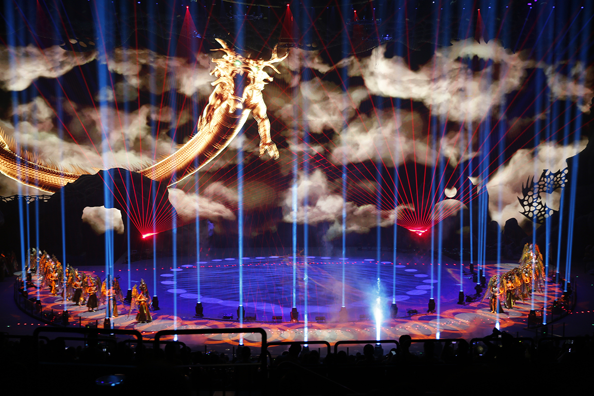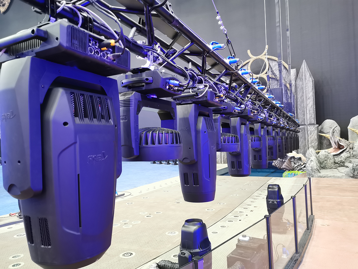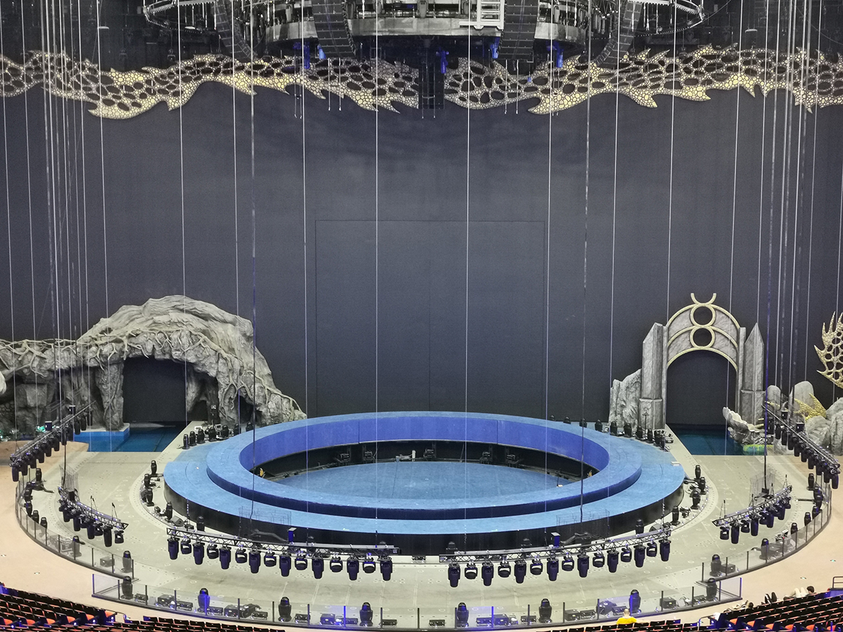 作為全新的文旅地標,長隆劇院設計體現出智能科技的前沿性和實用性。現場使用了實現實時升降的智能電腦燈具,其中浩洋電子傾力支持了大部分燈具,其中建筑照明燈GSARC DOT M系列提供了180臺,以科技之光點亮這場全新的大型馬戲,運用多屏幕的全景環繞技術將極致地將舞美、燈光、音響等元素重新定義整合,使劇情氛圍更加緊湊。