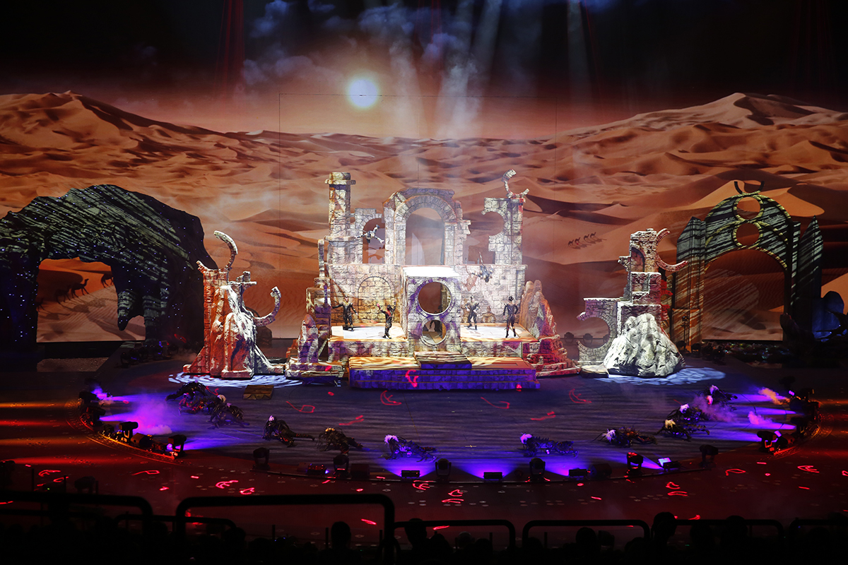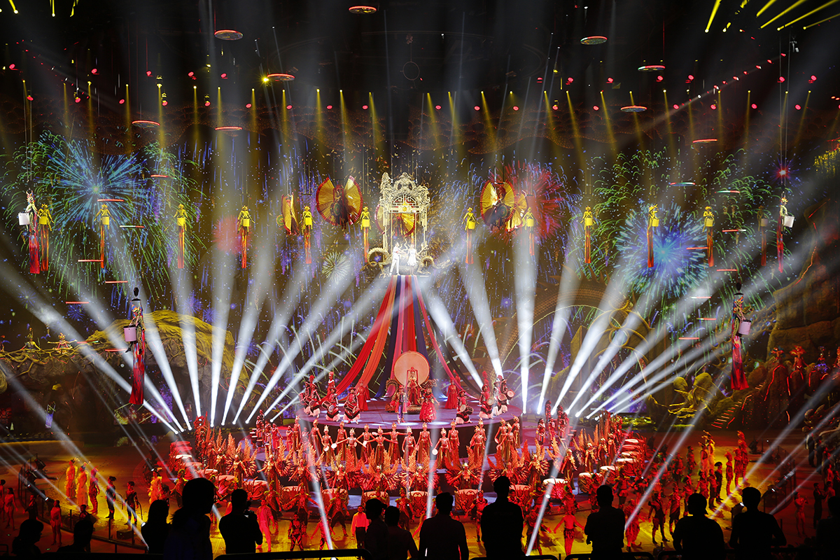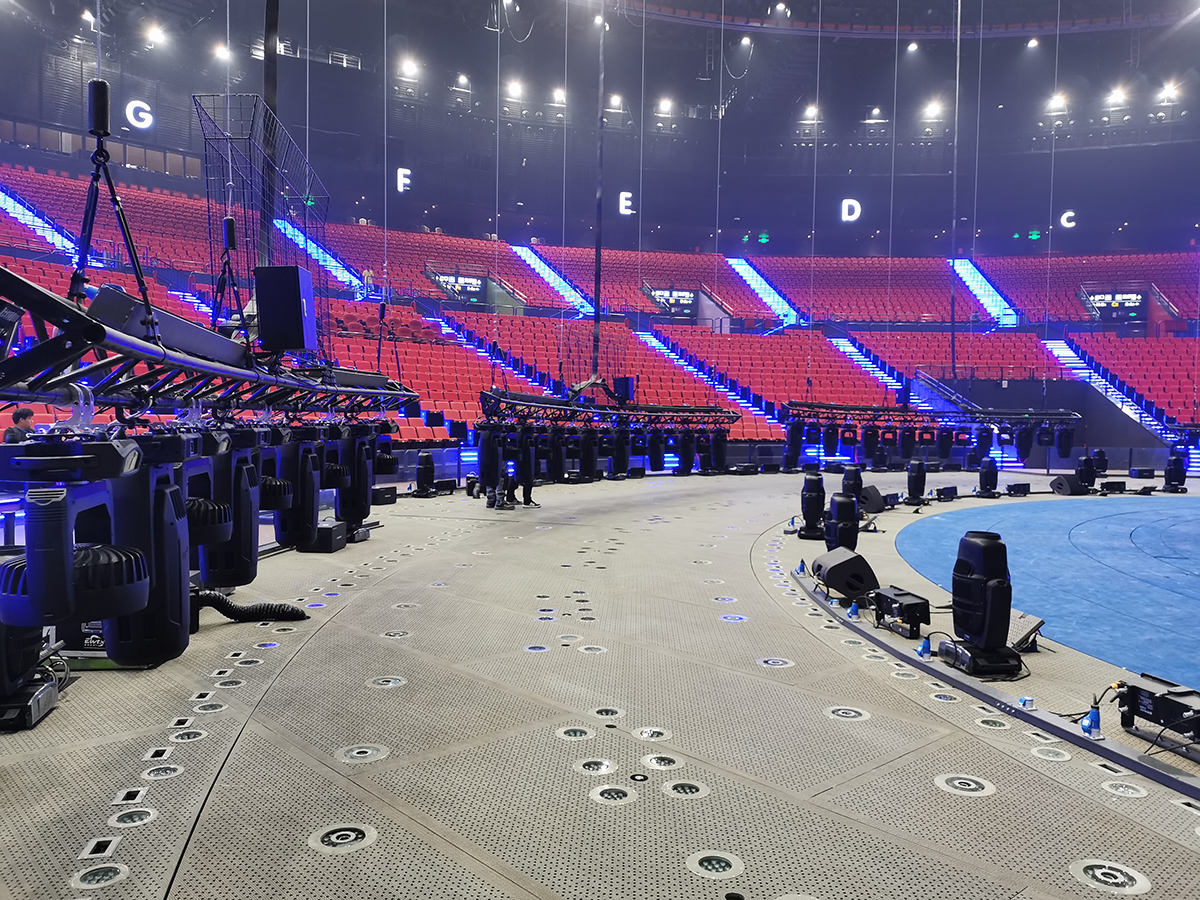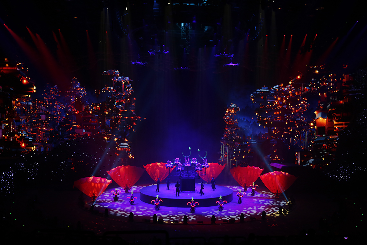 作為全新的文旅地標,長隆劇院設計體現出智能科技的前沿性和實用性。現場使用了實現實時升降的智能電腦燈具,其中浩洋電子傾力支持了大部分燈具,其中建筑照明燈GSARC DOT M系列提供了180臺,以科技之光點亮這場全新的大型馬戲,運用多屏幕的全景環繞技術將極致地將舞美、燈光、音響等元素重新定義整合,使劇情氛圍更加緊湊。