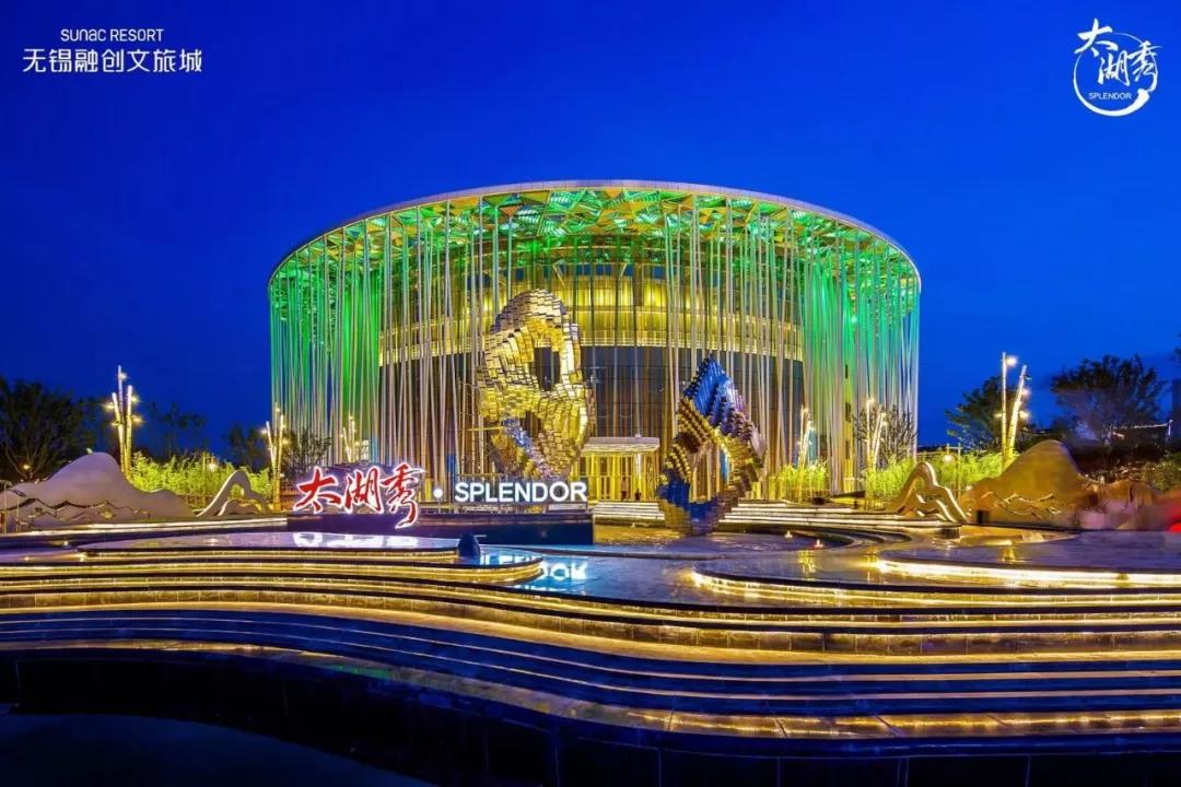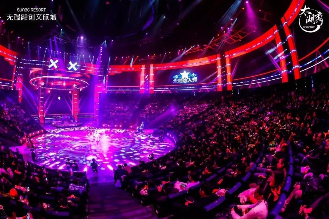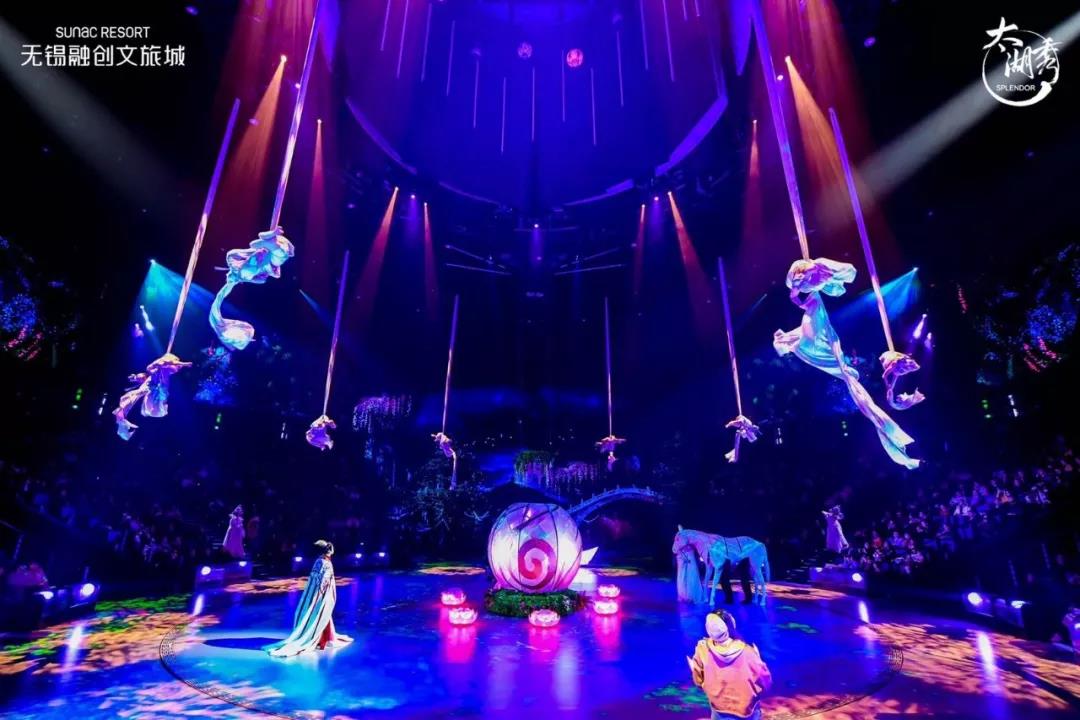太湖秀劇場的創作靈感來自于江南特色的“竹林”,外圍是365根層疊錯落的仿竹鋼立柱,屋頂使用不規則的三角形金屬百葉板進行裝飾。3萬平米的劇場內,直徑16米的主舞臺可實現360°旋轉、2米升降和10°傾斜,空中1800㎡的360°環形LED大屏嚴絲合縫,配合11臺高速布景吊機、22個高速雜技卷揚機、500多個高空舞美吊點打造沉浸式的視覺盛宴,此外還有先進的高空3D噴泉和舞臺水處理系統,可以實現干舞臺和水舞臺的快速切換。