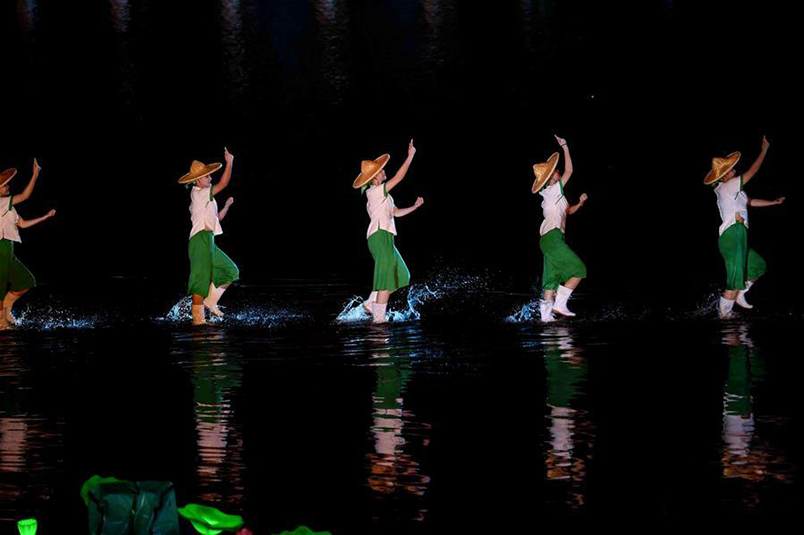 由于實景演出的舞美要求不能破壞大自然的原始形態,因此現場對視覺效果的塑造都押在了燈光創作上,由于現場表演規模宏大,尤其是在水面上染色,要做到色彩單純,光線分布均勻且具備足夠的亮度,同時保證遠景、近景的清晰可見,給觀眾帶去強烈的視覺感受。
