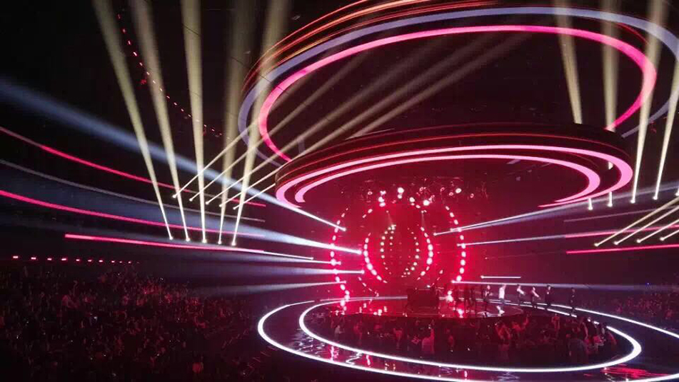 浩洋電子切割成像電腦燈V3000P擁有領跑行業的精準切割效果,能夠平滑、自然的切割出多種圖案,均勻順滑的CMY混色系統、0-100%線性調光和柔光霧化效果,可呈現出如呼吸般自然的光色變幻。這款成功服務過南京青奧會、APEC峰會和多屆央視春晚的頂級切割電腦燈,在歌會現場也被用作各種場景的切割造型和人物面光處理,配合浩洋電子經典款圖案燈V2500S,給觀眾帶去亦真亦幻的震撼視覺享受。