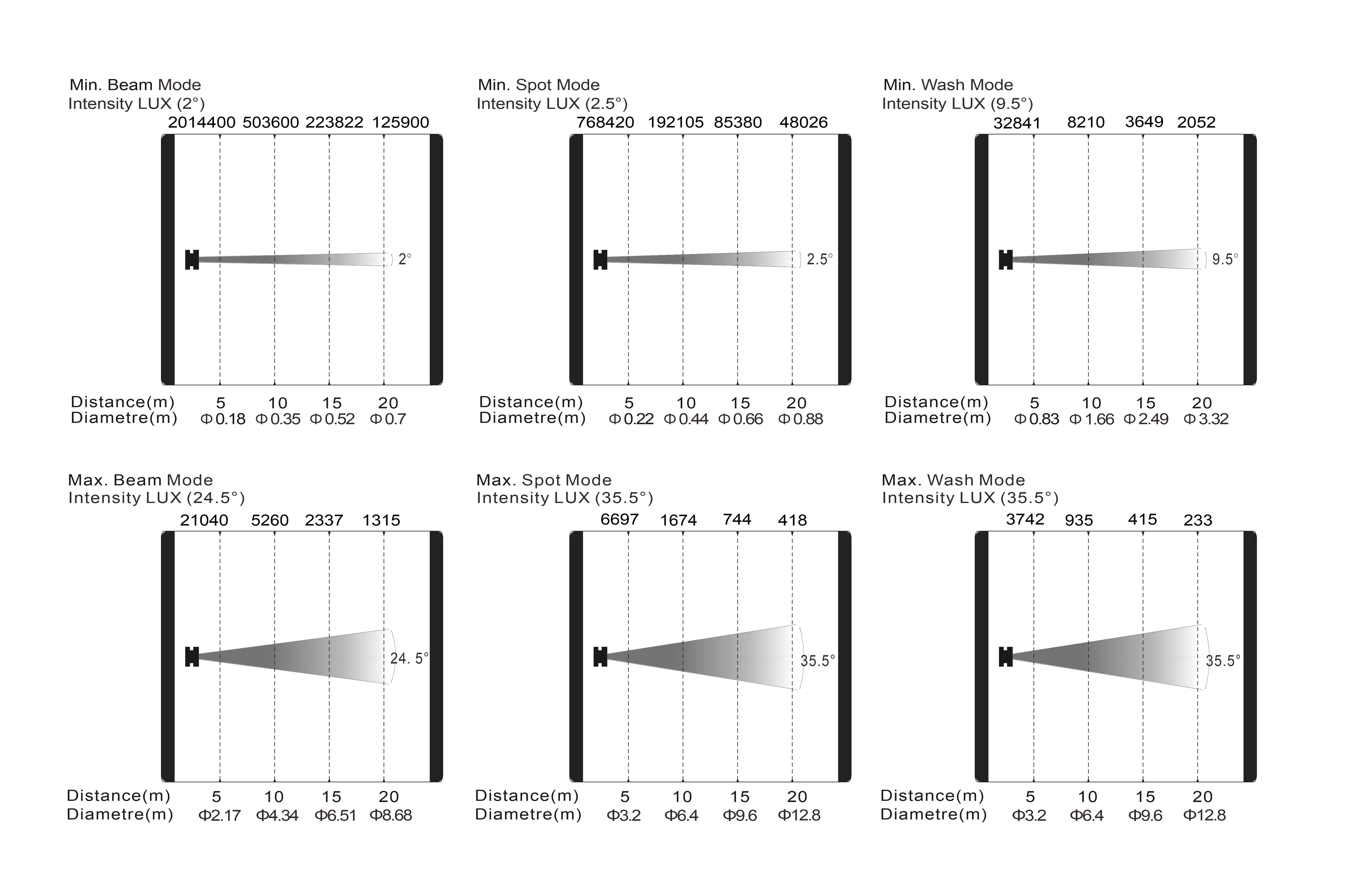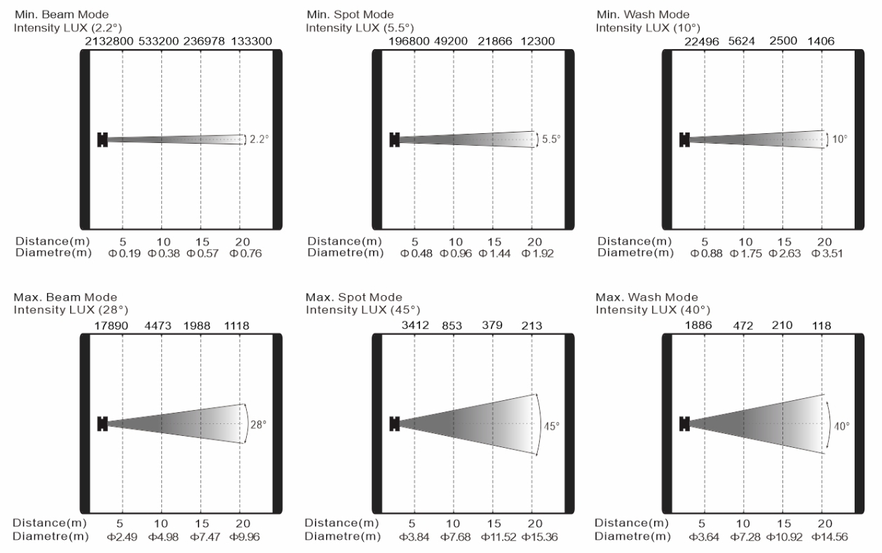變焦范圍:光束模式:2.2°- 28°;圖案模式:5.5°-45°;染色模式:10°-40°