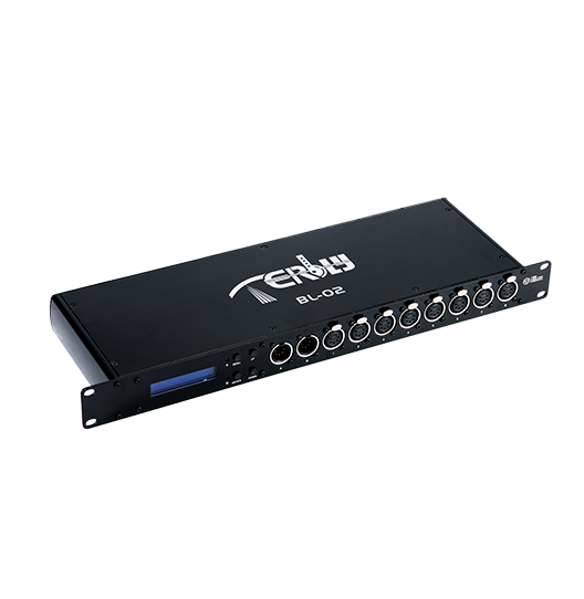 信號從A、B兩個信號端口輸入,可以轉(zhuǎn)置為由8個單獨輸出端口或4個一組的兩組輸出端口的DMX512標準信號通道,而且具備加強放大信號的功能。