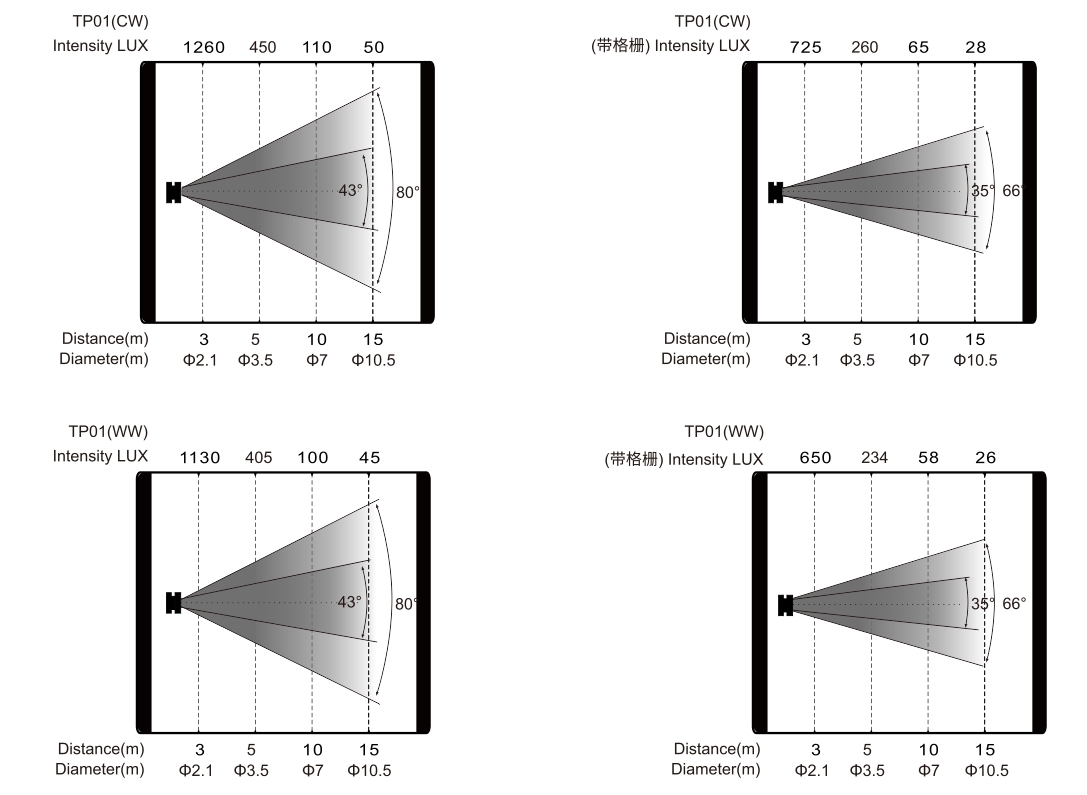 變焦范圍:光束角度:43°(可選格柵  35°),光斑角度:80°(可選格柵  66°)